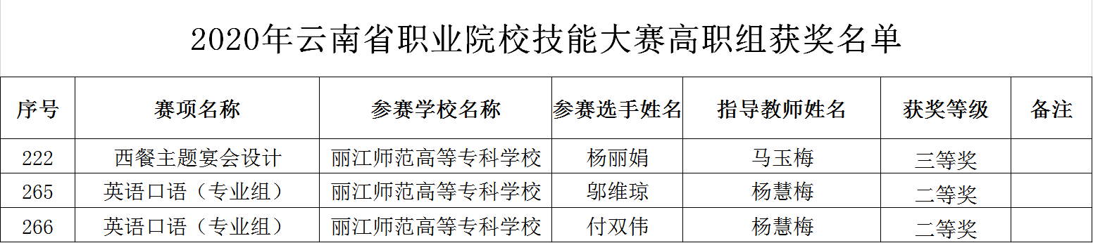 2020年4月27日,云南省教育厅发文《云南省教育厅关于公布 2020 年云南省职业院校技能大赛获奖名单的通知》(云教发〔2020〕25 号),公布 2020 年云南省职业院校技能大赛获奖名单。我院杨慧梅老师指导的邬维琼、付双伟两位同学参赛并获英语口语(专业组)项目两个二等奖;在马玉梅老师的指导下,杨丽娟同学在西餐主题宴会设计项目中荣获三等奖。