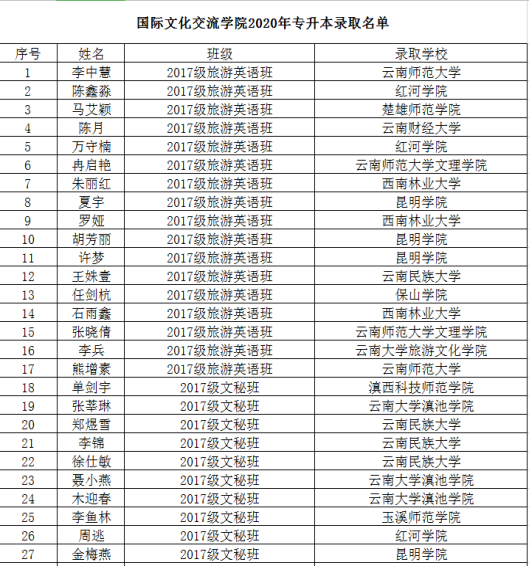 在2020年云南省专升本考试中,国际文化交流学院共179名同学参加考试。其中,150名学生分别被云南师范大学、云南财经大学、西南林业大学、红河学院、楚雄师范学院等本科大学录取。