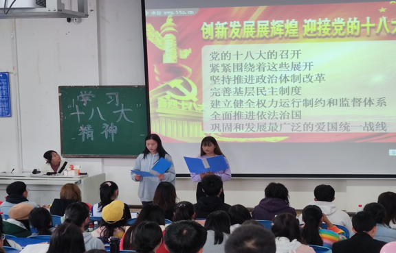 紧接着,2019 级英语教育一班宋冬丽 和2019 级小学教育二班张珍带来演讲《全面从严治党》党的十八大以来党内政治生活展现新气象。惩治腐败,净化党内政治生态。接下来2019级英语教育三班王莉宋梦静带来演讲《高举党的十八大旗帜,建设祖国美好明天》曾经的弱国发展为国际舞台上的一只重要力量,中国进入了新的时代。