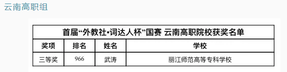 在经过2021年5月9日省赛和6月6日国赛的角逐后,我校2020级学前教育3班武涛同学获得首届“外教社·词达人杯”全国大学生英语词汇能力大赛——全国决赛(高职组)三等奖!