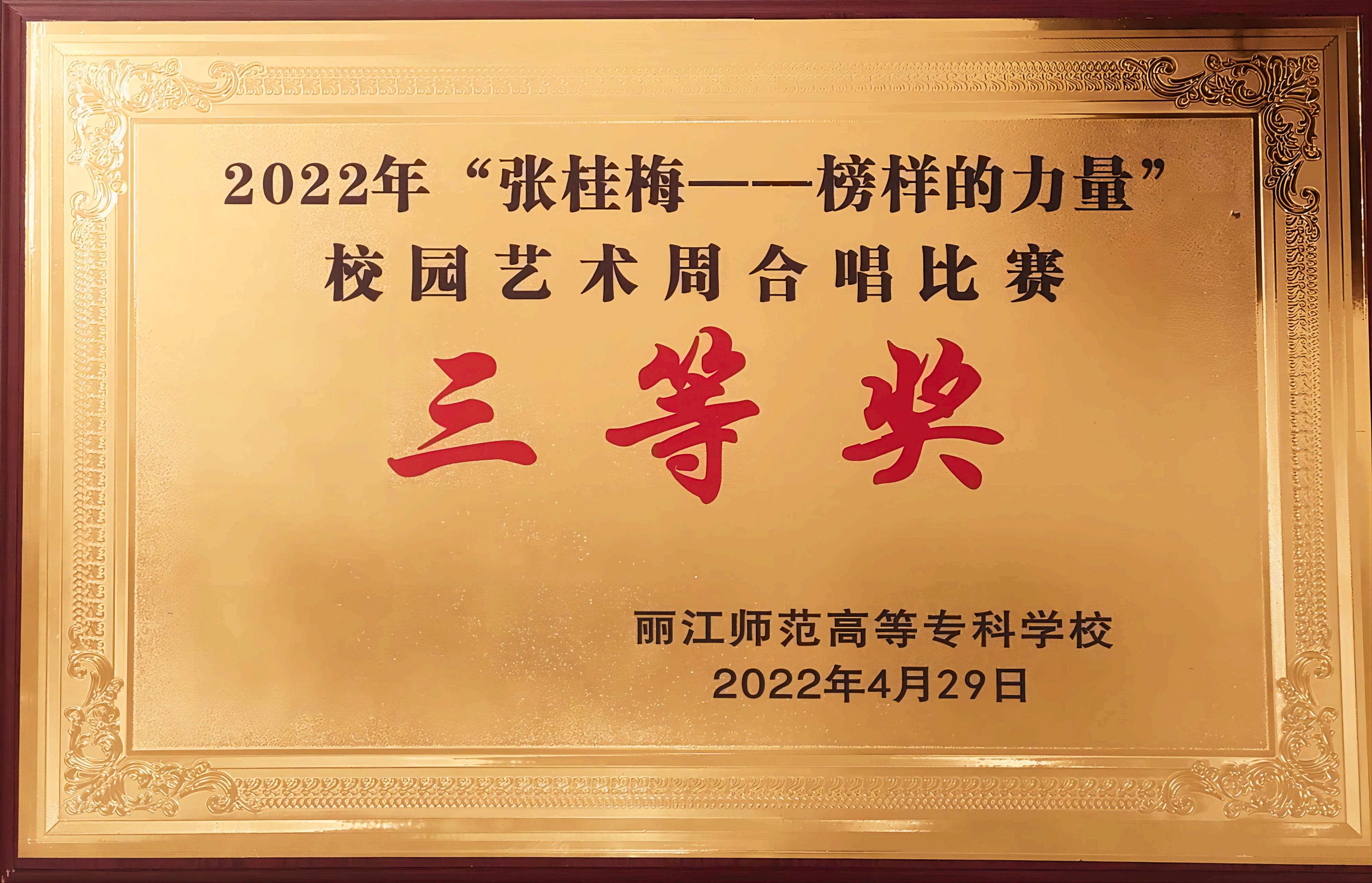 经过1个多月的辛苦排练,由2020级、2021级100名学生组成的外国语学院合唱团在2022年“张桂梅——榜样的力量”校园艺术周合唱比赛中赛出了第四名的好成绩,荣获全校三等奖。本次比赛共有10支队伍参赛,设一等奖1名,二等奖2名,三等奖3名,优秀奖4名。