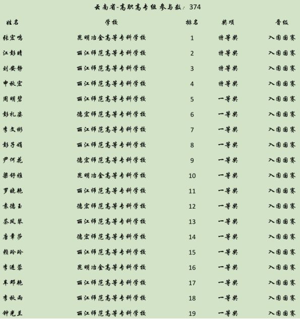 在经过2022年4月17日校赛和5月21日省赛的激烈角逐后, 我校共计33名学生在第二届“外教社·词达人杯”全国大学生英语词汇能力大赛(高职高专组)全省决赛中分获特等奖、一等奖、二等奖、三等奖,其中特等奖获奖人数为3人,在获奖总人数(4人)中占比高达75%,一等奖获奖人数9人,在获奖总人数(15人)中占比高达60%。获特等奖和一等奖的12名学生同时取得大赛全国决赛入围资格,且在云南省晋级总人数(19人)中占比高达63.2%。