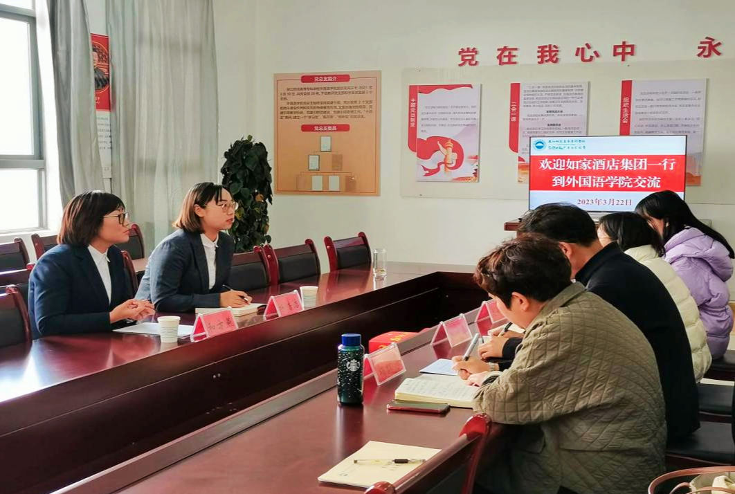 3月23日下午,丽江市首旅如家酒店集团一行2人到外国语学院开展企业进校园交流活动。学院党总支书记李根艳,院长段平华,副书记杨红芳,旅游英语教研室主任周丽云,2023届毕业班辅导员李佳倩参与本次座谈。