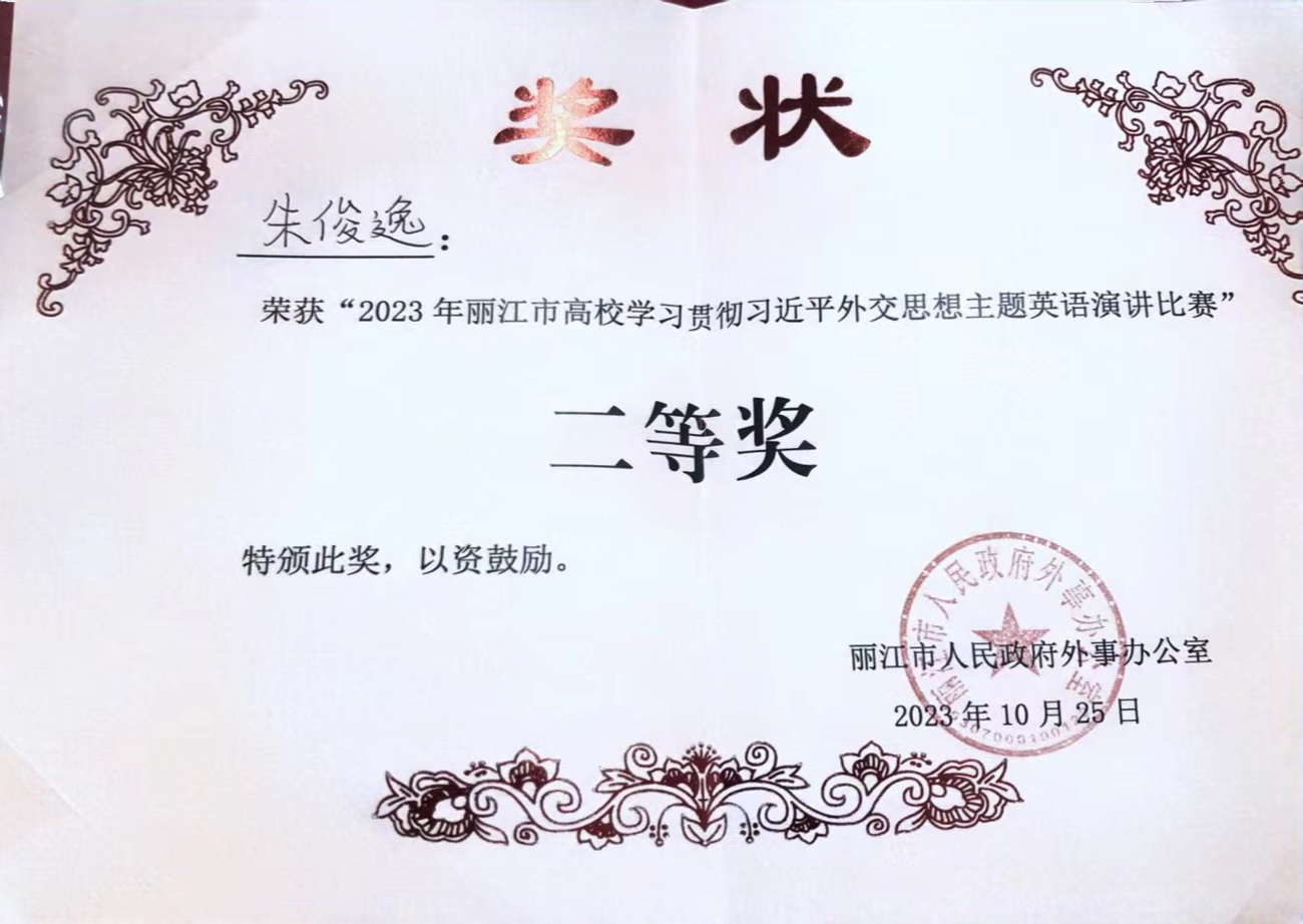 2023年10月25日,丽江市人民政府外事办公室举办了“丽江市2023年贯彻落实习近平外交思想高校演讲比赛”。本次比赛旨在助力高校积极宣传党的二十大精神和习近平外交思想,全面提升高校在校生国际视野和交流能力水平,为丽江世界文化旅游名城建设储备国际型人才。