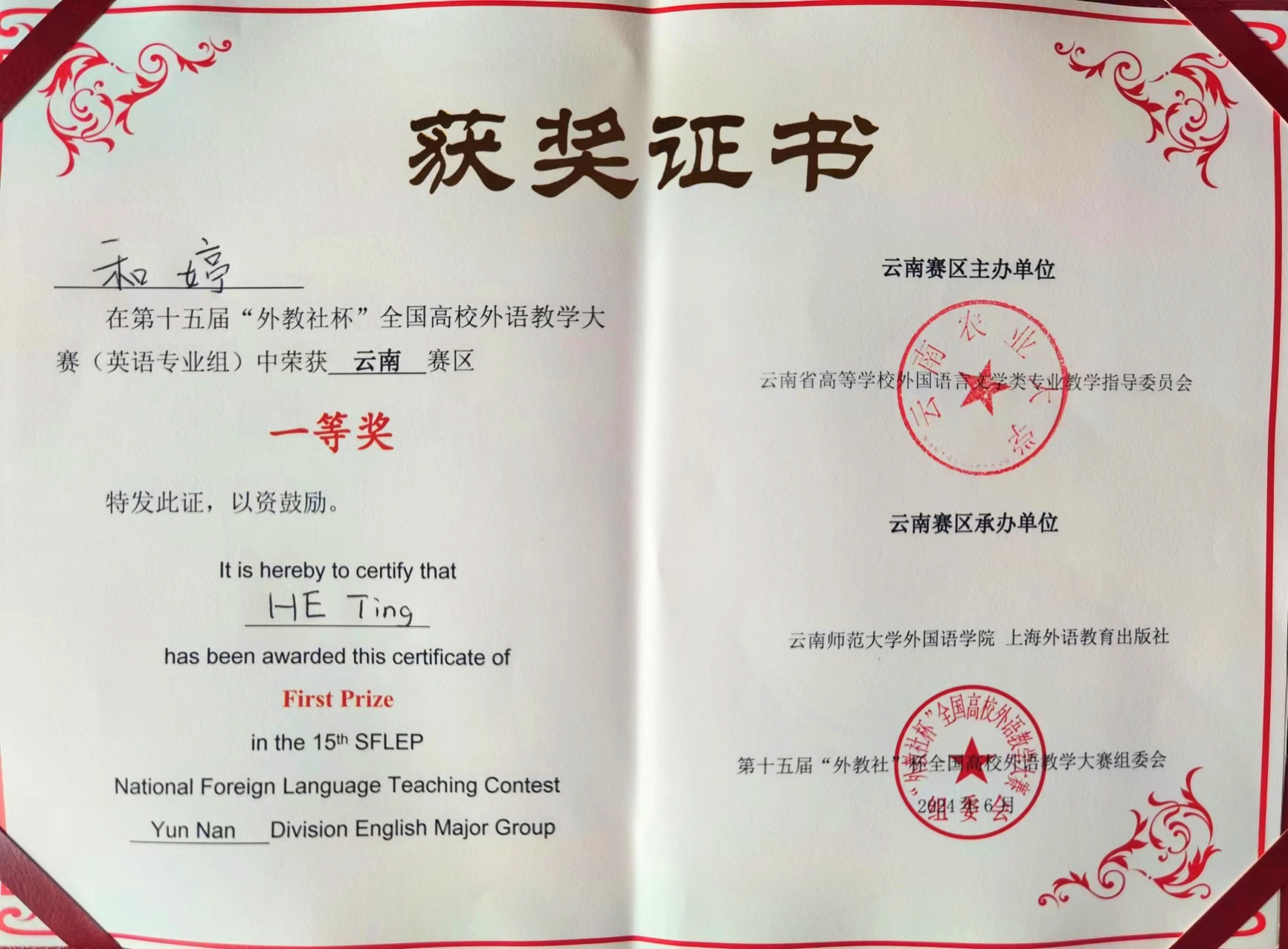 629日至30日,由云南省高等学校外国语言文学专业教学指导委员会主办,云南师范大学外国语学院、上海外语教育出版社承办的第十五届外教社杯全国高校外语教学大赛云南赛区决赛在云南师范大学举行。本次大赛组别设英语专业组和商务英语专业组,比赛环节包括现场授课、教学设计展示(复赛)、指定材料限时说课和专家提问(决赛)。来自我省多所本科院校的20名英语专业教师和9名商务英语专业教师参加了本届比赛,我校外国语学院教师和婷凭借扎实的专业素养和出色的教学表现,成功晋级英语专业组决赛并荣获一等奖。