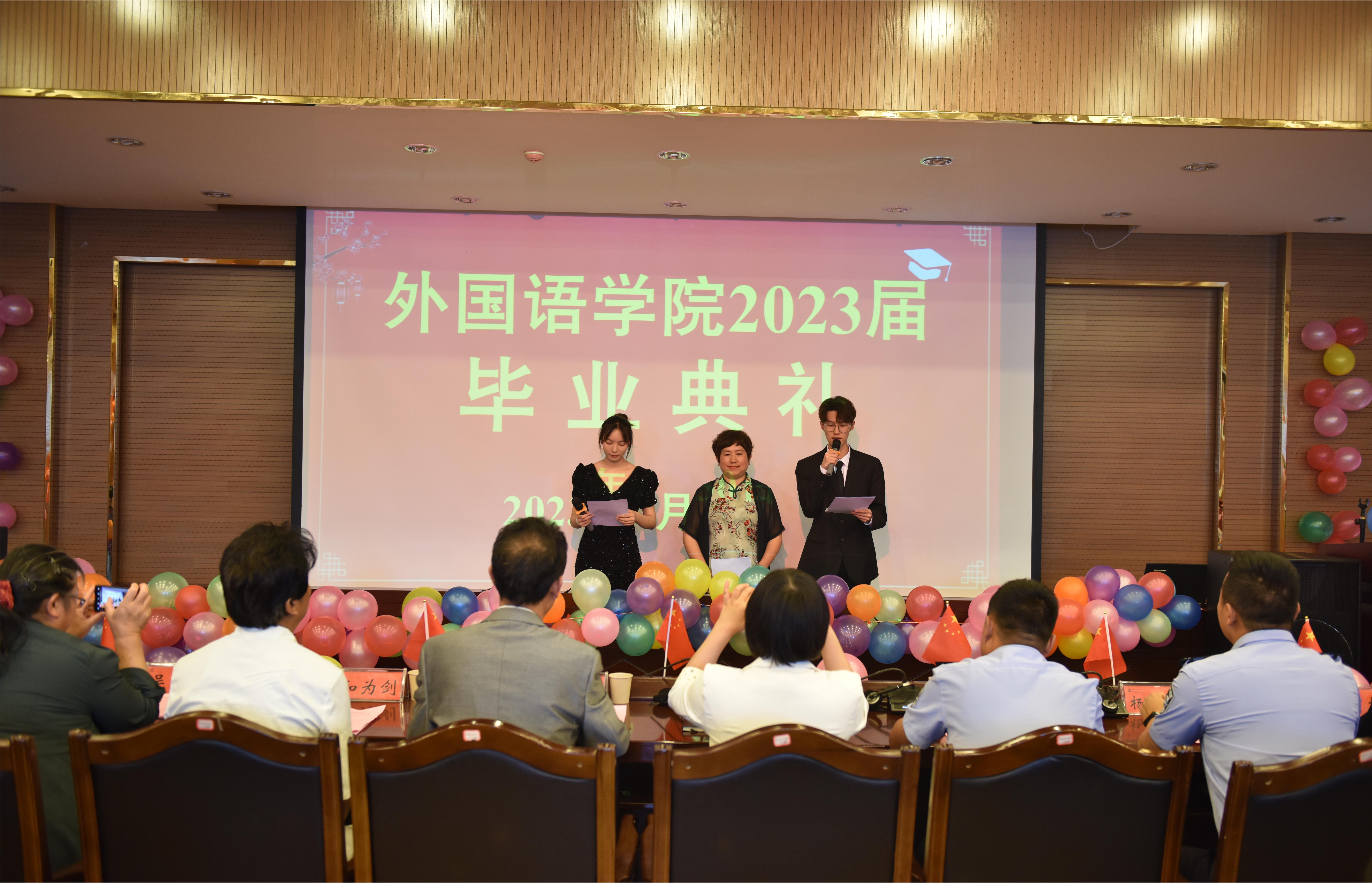 2023 年6月30日上午,外国语学院在求是楼多功能报告厅举行2023届毕业生毕业典礼。在庄严的国歌声中,毕业典礼拉开序幕。典礼由外国语学院党总支副书记杨红芳主持,学院党总支书记李根艳、院长段平华等学院党政领导班子、毕业生班主任、辅导员及2023届毕业生代表出席本次活动。