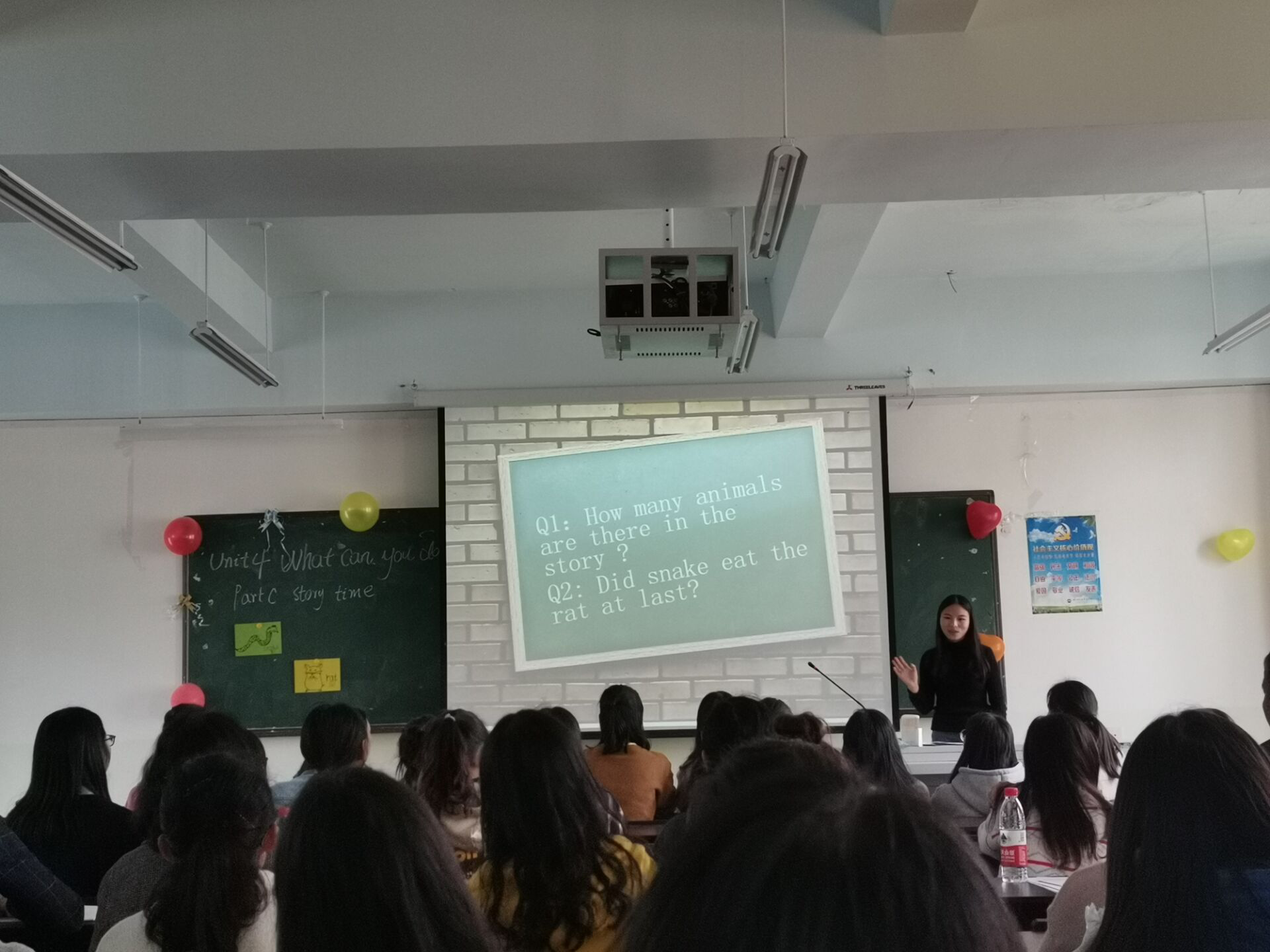 其次,选手们开始了专业教育课程。由于我校教育专业主要以培养小学老师为主,在模拟教学部分,选手选用丰富多彩的教学手段模拟教学过程。例如:听音乐歌曲、角色扮演、绘画。选手用生动的语言动作教学,观众们也积极配合。在说课环节,参赛选手们逻辑清晰,语言流利,表现良好,向评委老师讲解自己的教学方案。