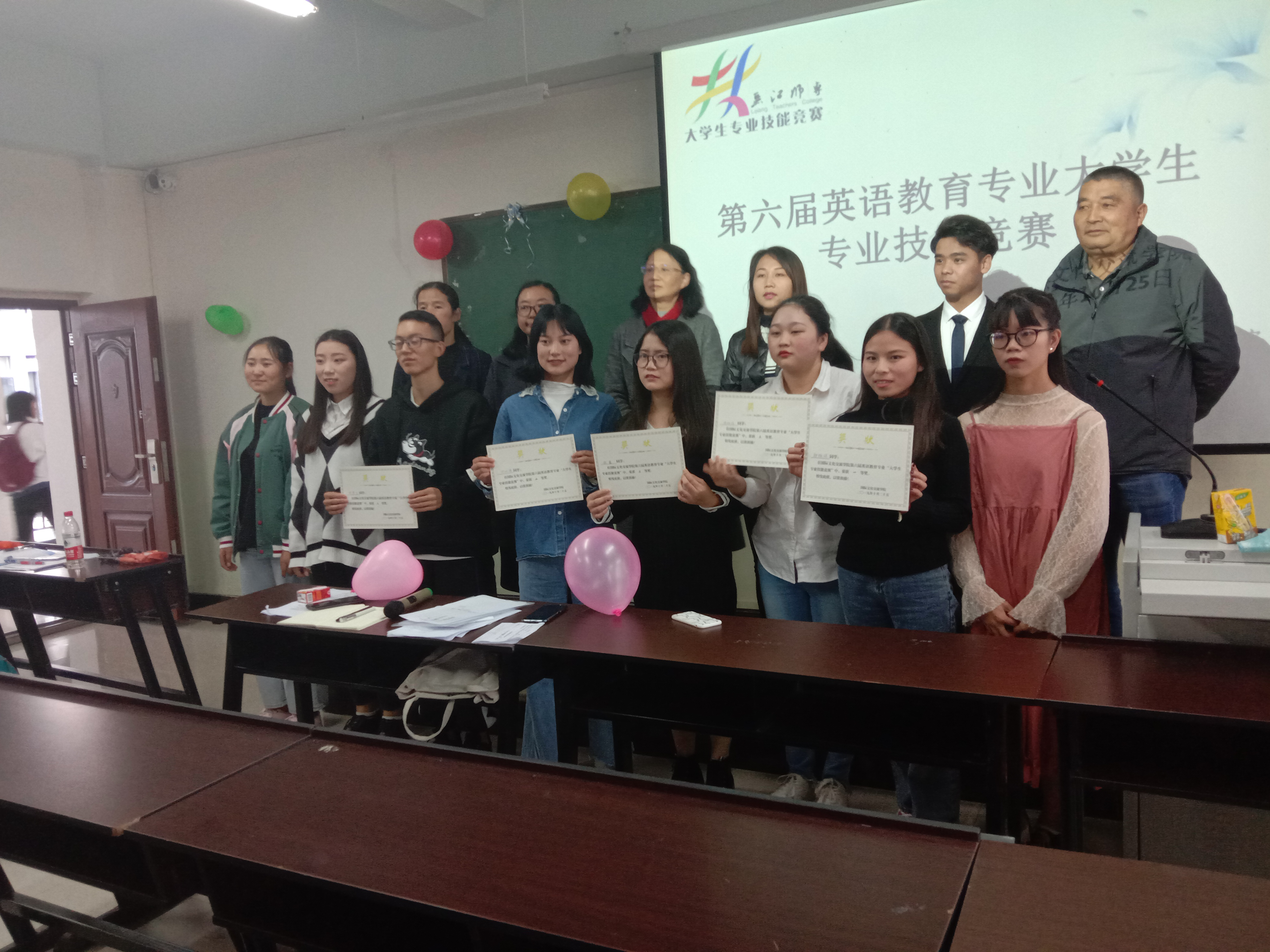 2019年10月25日下午5点半,国际文化交流学院主办的第六届英语教育专业大学生专业技能竞赛圆满取得成功。大学生专业技能大赛对同学们交流学习及展示自我风采具有重大意义,有利于鼓励更多同学提高自身教学专业能力。该活动由我校英语教研组担任评委老师,参赛选手共有九名,为提高竞赛活动的质量并为同学们提供学习的机会,此次活动的观众即模拟学生为2019级的英语教育一班、二班、三班。
