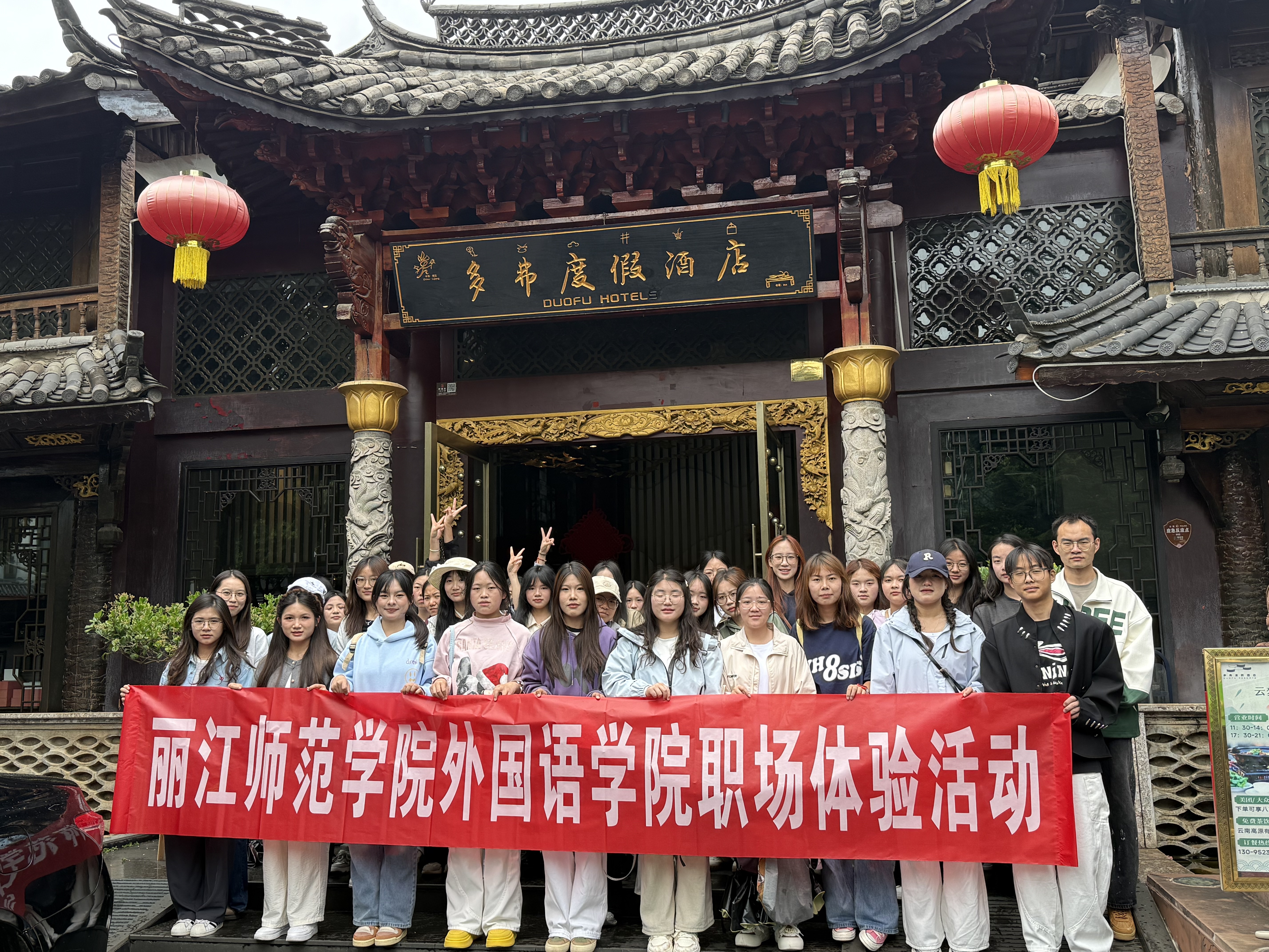 为响应团省委组织学生积极参与就业实习活动的要求,提升学生职业素养与实践能力,5月31日,外国语学院组织40余名学生走进丽江多弗度假酒店,开展了一场内容丰富的职场体验活动。此次活动通过实地观摩、技能实践与文化体验相结合的形式,助力学生深入了解酒店行业运作,拓宽职业发展视野。